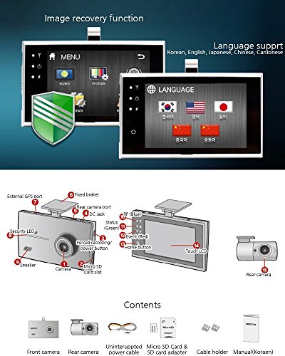 -. Feature : Language Support : Korean, English, Japanese, Chinese, Cantonese / Camera resolution HD 1280x720 (front, rear) , Memory storage support 16GB~64GB , Undervoltage lockout Supported / Recording model Driving record, event recording, Parking record, forced recording / Contents : Front camera, Rear camera, Uninteruppted power cable, SD card (Separate purchase External GPS Cable) / Format-Free Function : Videos cannot be saved successfuly if there's accident before the videos are moved from RAM to SD card. Unlike normal blackboxes, X500 saves videos directly in SD card(Skip saving in RAM).