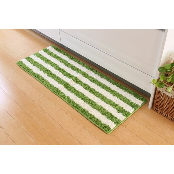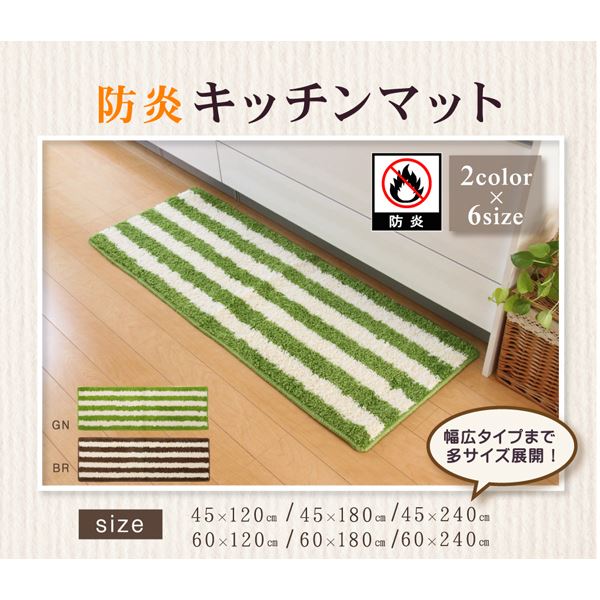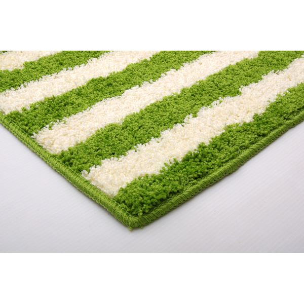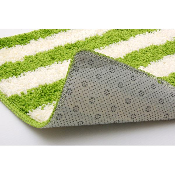 防炎糸を使用したシンプルなボーダー柄のマットです。表面は毛足が長くふわふわとした踏み心地です。裏面にはすべりにくい加工を施しています。ご家庭の洗濯機で洗えるのでお手入れも簡単です。(洗濯の際はネットをご使用ください)