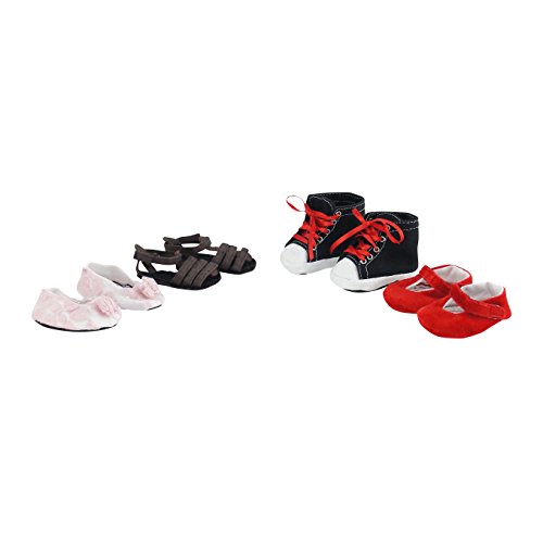 -. Title : 18-inch Doll Clothes | Value Pack - Set of 4 Fabric Slip on Doll Shoes, Including Brown Summer Sandals, Red Velvet Mary Jane's, Black Sneakers and Pretty Pink Lace Slippers | Fits American Girl Dolls