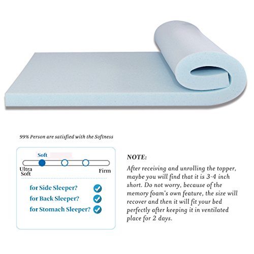 -. Feature : SAVE YOUR CURRENT MATTRESS: This 3" Thick AirCell Technology memory foam mattress topper will bring new life to your current mattress. The ventilated gel-infused memory foam captures and distributes heat, allows air flow and helps regulate sleeping temperature, reduces tossing and turning, eliminates motion transfer, and provides a great nights sleep. Never go flat with use. TWIN Size - Measures 37.5 x 74 x 3 inches / BALANCE SUPPORT FOR WHOLE BODY - Conforms to the curves of your body for greater pressure relief and provides proper spinal alignment and personalized support. This mattress topper will help relieve neck, back and shoulder pain by reducing pressure points. This in turn helps to correctly align your spine by supporting the natural curves of your head, neck and shoulders / MATCHED COVER is removable and washable, help protect the topper from water and staining, keep your topper in P.R.Istine condition and prolong its lifetime. Mite and Allergen Proof & Anti-mite / SMARTLY SHIPPED - Our patented technology allows our mattresses to be efficiently compressed, rolled and shipped in a box conveniently to your door. However, after receiving and unrolling the topper, maybe you will find that it is 3-4 inch short. Do not worry, because of the memory foam's own feature, the size will recover and then it will fit your bed perfectly after keeping it in ventilated place for 2 days / FIVE-YEAR WARRANTY provides increased peace of mind for your purchase. The foam is CertiPUR-US certified. It contains no formaldehyde, harmful phthalates, or PBDE flame retardants and is low VOC. This mattress does not contain synthetic or natural latex of any kind. In case you experience an slight odor which is a "Fresh Foam" odor, it is not harmful. The odor should dissipate within 30 minutes from when the foam is unpacked and aired out. And it is complete expansion whitin 30 minutes