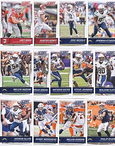 San Diego Chargers 2016 Score NFL Football Factory sealed 13 card team set including Philip Rivers, Melvin Gordon, Danny Woodhead, Keenan Allen, Malcom Floyd, Steve Johnson, Antonio Gates, Ladarius Green, Melvin Ingram, Jeremiah Attaochu, Eric Weddle and Rookie cards of Hunter Henry and Joey Bosa
