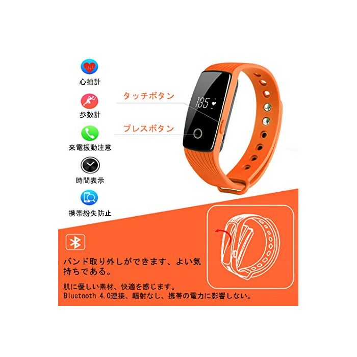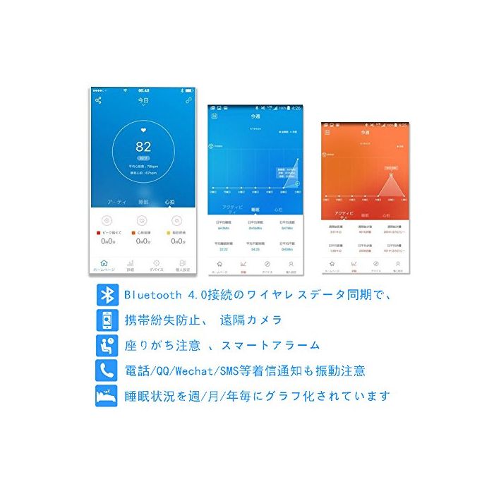【기능】심박수계측,활동량 계측,보수계-페도미터,시계,날짜,주행 거리,칼로리 소비.Bluetooth 4.0접속 wireless 데이터 동기에,수면검측,,휴대 분실 방지,원격 카메라,스마트 알람,안정도가 # 주의,전화/메일/QQ/Wechat/SMS등 착신 통지도 진동 주의.또는 심박수,활동량계(보수/이동 거리/칼로리 소모)고, 수면 상황을 주/월/해마다 그래프화 되어 있습니다. 더욱 좋은 몸의 건강 상황을 파악에 옵니다.