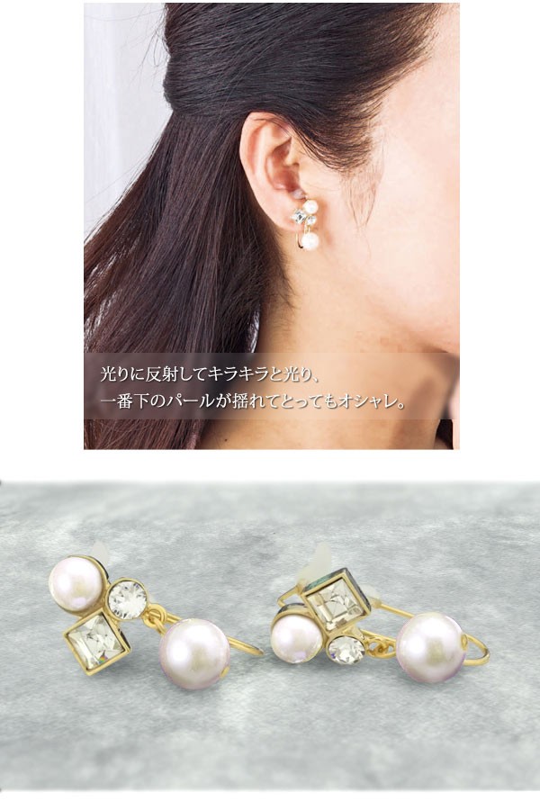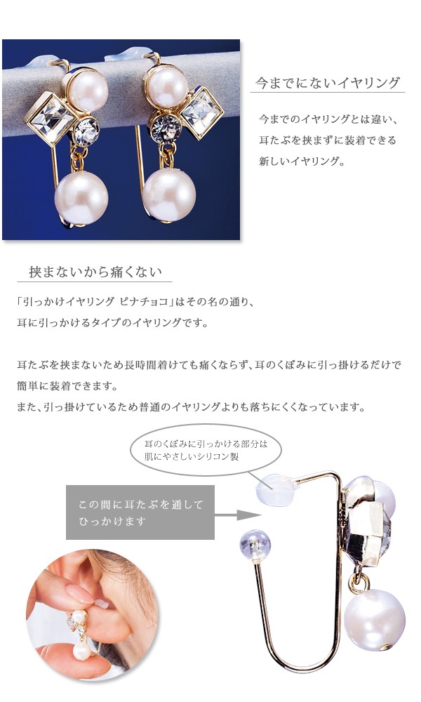 | 従来のイヤリングは耳たぶを挟む形状がですが、この商品はクリップ状になっており、耳のくぼみに引っかけて使用します。長時間の着用でも痛くなりにくく、シリコン部が耳のくぼみにフィットするため、落ちにくくなっています。イヤリング/ピアス/アクセサリー/痛くない/挟まない/落ちない/フック/シリコン/パール/ガラス/ゴールド/揺れる/パーティー/冠婚葬祭/フォーマル/結婚式/入学式/卒業式 |