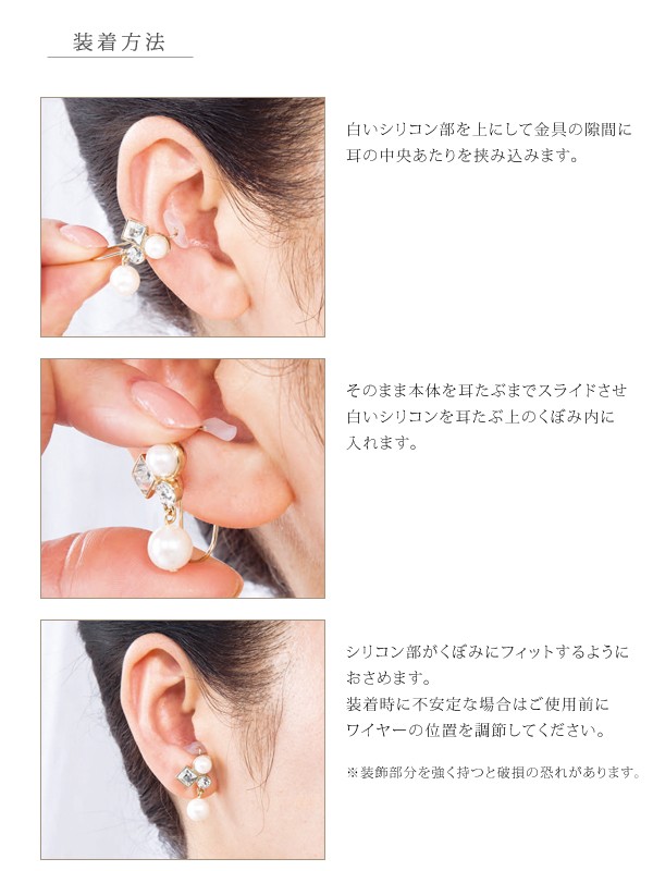 | 従来のイヤリングは耳たぶを挟む形状がですが、この商品はクリップ状になっており、耳のくぼみに引っかけて使用します。長時間の着用でも痛くなりにくく、シリコン部が耳のくぼみにフィットするため、落ちにくくなっています。 |