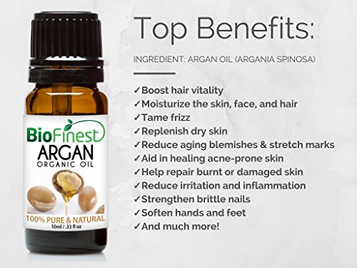 BioFinest 100% pure argan oil the secret to your soft skin and silky hair BioFinest argan oil is 100% pure certified organic premium quality, non-diluted, with no fillers or additives. Here's what you'll discover. Hair treatment conditions for a natural shine without looking oily. Anti-frizz and separates waves and curls. Nourishes dry scalp, removes split ends. Leaves color-treated hair soft, shiny, and easy to handle. Skin treatment moisturizes dry, chapped, scaly, flaky, cracked, itchy, and sensitive skin.Excellent for the cold winter season. Works on the heels of feet as well. Absorbs into skin quickly, non-greasy feel.Leaves skin smooth, and moist unlike heavy creams that leave you oily. No sticky residue, so your bed linens won't get stained. Contains healing properties to diminish stretch marks rejuvenates nails and softens cuticles. No unpleasant odor. Has a mild nutty scent. Treatment for your face rich in antioxidants for anti-aging. Diminishes wrinkles, lines around the eyes and mouth, bags under eyes. Moisturizes face to re-balance skin for even texture. Does not clog pores. Helps clear up blemishes and eliminate acne scars.Feature