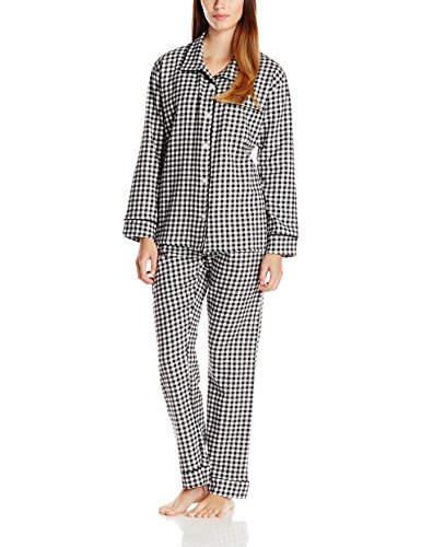 Two-piece pajama set featuring gingham button-front long-sleeve top with solid piping and print-matched chest pocket