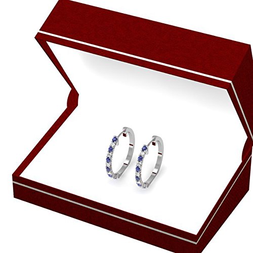 -. Title : 14k White Gold Round Blue Sapphire & White Diamond Ladies Hies Hoop Earrings