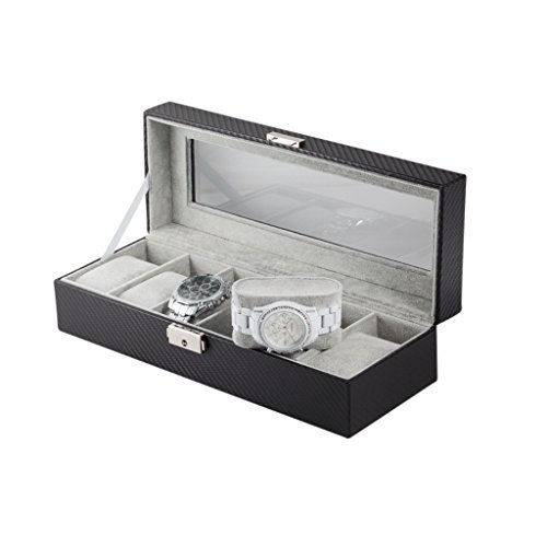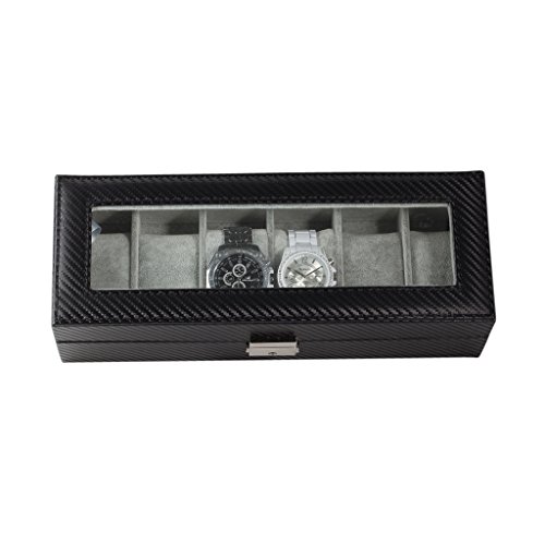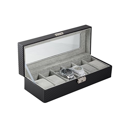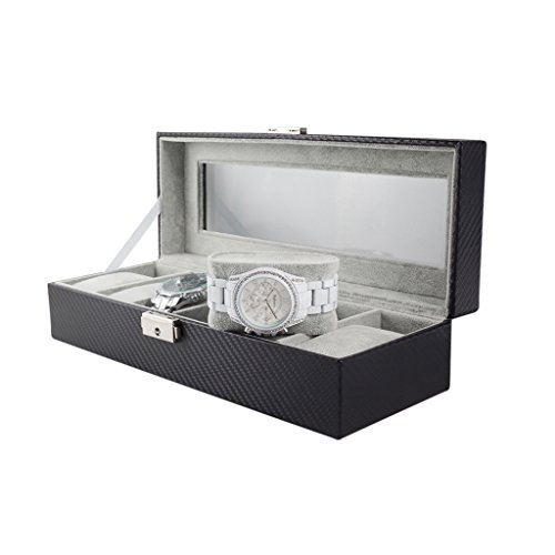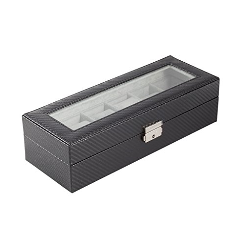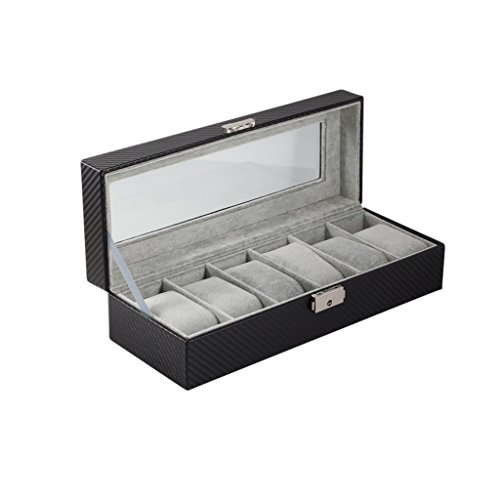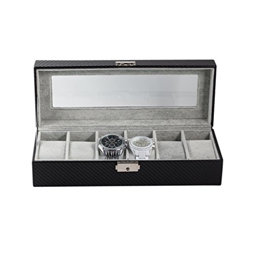 6 Slot Carbon Fiber Pattern Watch Box Jewelry Display Storage Case with Lock and Key Functionality We created this watch case to hold 6 of your favorite watches or jewelry pieces. The top portion of the case comes with a lock and key. This way you can store some of your most precious jewelry in the case along with your watches, simply remove the velveteen cushions if needed. Additionally, we've included a sliding draw (that doesn't have a lock) to provide you with easy access to some of your favorite pieces that you use on any day. Design We chose the carbon fiber pattern so the case really can add a touch of luxury to any room it is placed in. With the viewing window over your most precious time pieces, you'll be able to show them off safely and elegantly. We've also left some clearance space, so your new premium watch box will be able to accommodate the more modern, large-face, watches. Each of the 6 spaces can hold 46mm watches. Watches with 55mm faces will also fit in the case as long as they are not directly next to each other. Most standard watches have 45mm or lower faces. Full box measues 12 x 4.5 x 3 inches. Satisfaction Guarantee We offer 100% satisfaction guarantee! 0 |