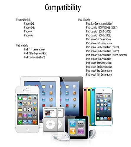 Compatible with iPhone 4s, iPhone 4, iPhone 3GS, iPhone 3G, iPad (3rd generation), iPad 2, iPad 1, iPod touch (1st through 4th generation), iPod classic, and iPod nano (1st through 6th generation).
