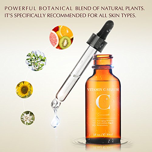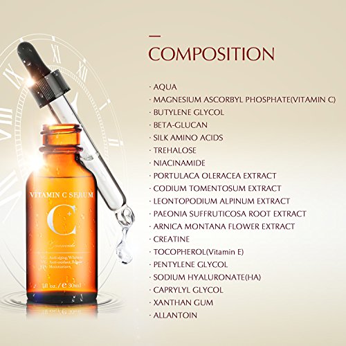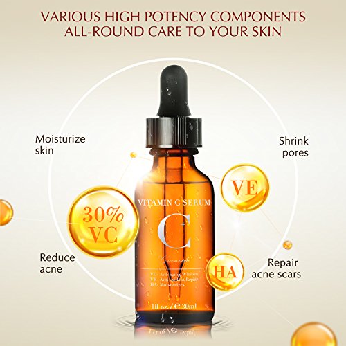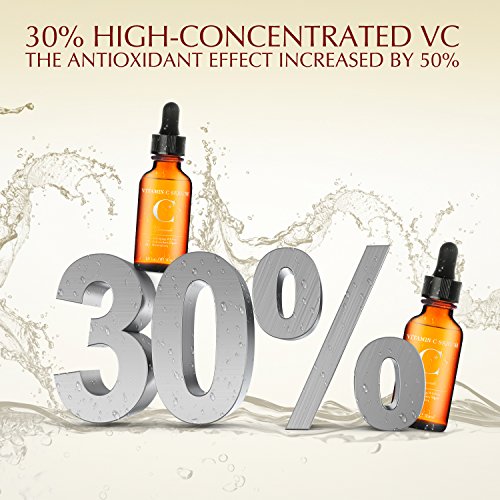 -. Feature : Good Quality & High Concentration --- This Vitamin C serum contains 30% pure Vitamin C, which is 1.5 times higher than other Vitamin C serum. Our Vitamin C face serum is proven to be much more effective than taking it orally in replenishing Vitamin C for your skin. / The Secret of Reversing Time --- With powerful anti-aging formula, the Vitamin C skin serum stimulates the generation of collagen album and reduce wrinkles and fine lines. This anti aging serum also helps diminish the dark spots and hyperpigmentation, making your skin youthful and glowing / Multi-Purpose Correction --- Adding Vitamin E and Hyaluronic acid, this serum for skin can shrink pores, reduce acne and acne scars. Besides, it helps deeply nourish skin, which makes your skin smoother and well-hydrated, showing your true beauty. / Rapid Absorption --- The Vitamin C serum can quickly infiltrate into skin without any oily feeling, making your skin smooth and bright. Help you save a lot of make-up time in a hurry morning. / Gentle Formula & Cruelty-Free Product --- The Vitamin C facial serum is formulated with the highest quality of natural organic constituents, with no irritation. Importantly, our product promises not to test on animals.