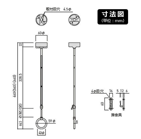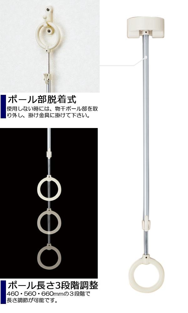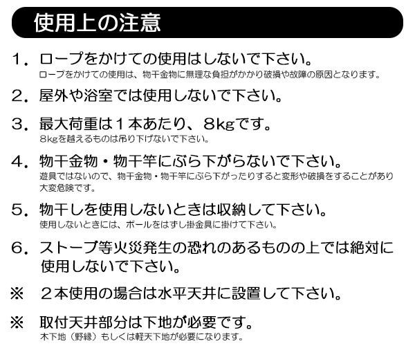 使用しない時には、物干ポール部分を取外し、掛け金具に掛けてください。取付天井部分には下地が必要です。2本使用の場合は水平天井に設置してください。 |
