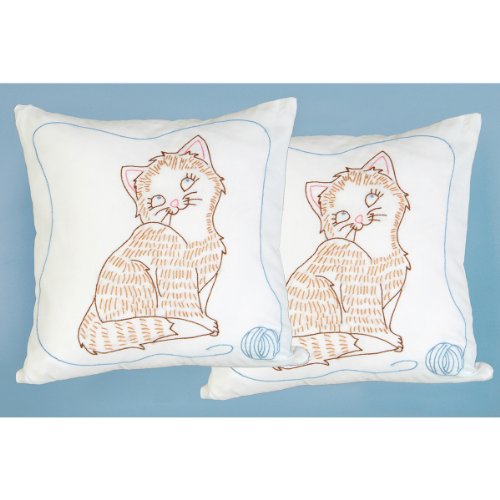 Jack Dempsey Stamped White Pillow Tops, 15-Inch by 15-Inch, Kitty Cat, 2-Pack