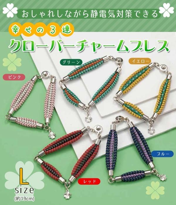 | かわいいクローバーチャームが付いた静電気除去ブレスレットです。銅複合導電性繊維は、静電気を空気中に放電し除電する作用があります。また、ワンタッチ留め具で付け外しが簡単です♪ |