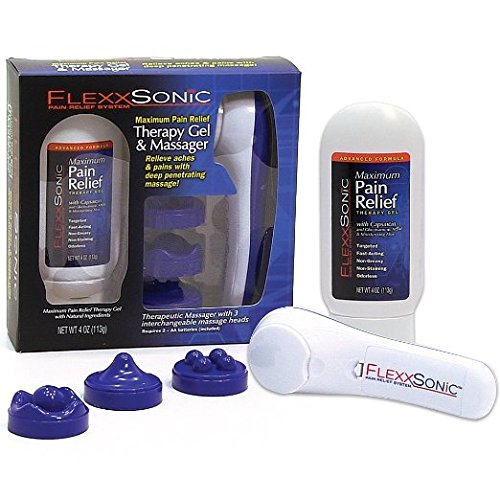 Studio : FLEXXSONIC, INC. Publisher : FLEXXSONIC, INC. Binding : Health and Beauty Product Description FlexxSonic Pain Relief Gel- Relief Back Pain and Therapeutic Massage Device Flexx Sonic Pain Relief Kit Deep-penetrating massage and soothing gel come together to deliver maximum relief from pain associated with arthritis, backache, strains, and more! Powerful massager features 3 interchangeable massage heads and 2 speeds for targeted, custom relief. Advanced-formula pain-relief gel contains natural ingredients including capsaicin, glucosamine, MSM, and moisturizing aloe. 4-oz. bottle. 6"L massager. Includes 2 AA batteries.