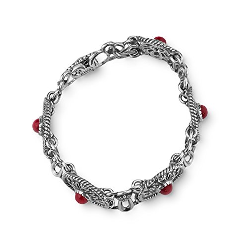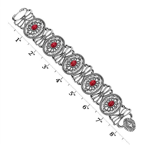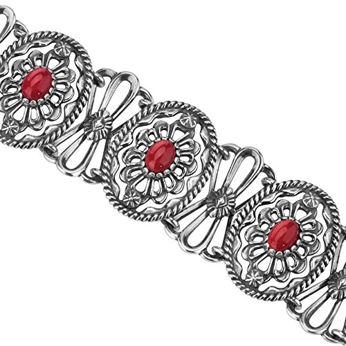 From the American West Classics Collection - Sterling silver openwork concha designs with textured rope detail lay the beautiful backdrop for this intricate and unique bracelet. Oval cabochons of red coral sit center stage in each of the conchas for a pop of color and fun! Finished with a sterling silver clasp closure.