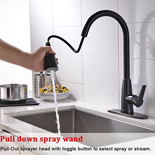 Kitchen faucets with pull-down spayer, the toggle button to select spray or stream modes conveniently in the palm of your hand.