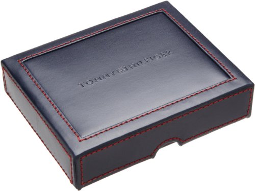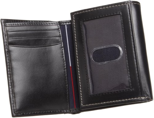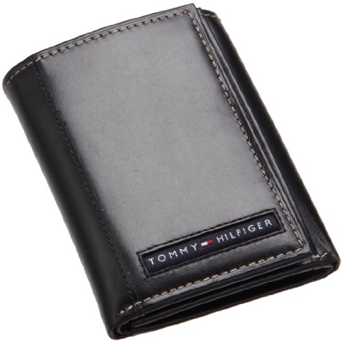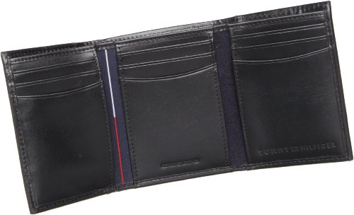 The Tommy Hilfiger Trifold Wallet measures 8.9" x 4" and features a blue ribbon inlay. This black leather trifold wallet features a trifold design with two lengthwise bill compartments, 9 total credit card slots, an ID window in the outer right, extra removable plastic credit card slots and 3 hidden card slots. Each wallet comes in a Tommy Hilfiger Valet Gift Box.Feature