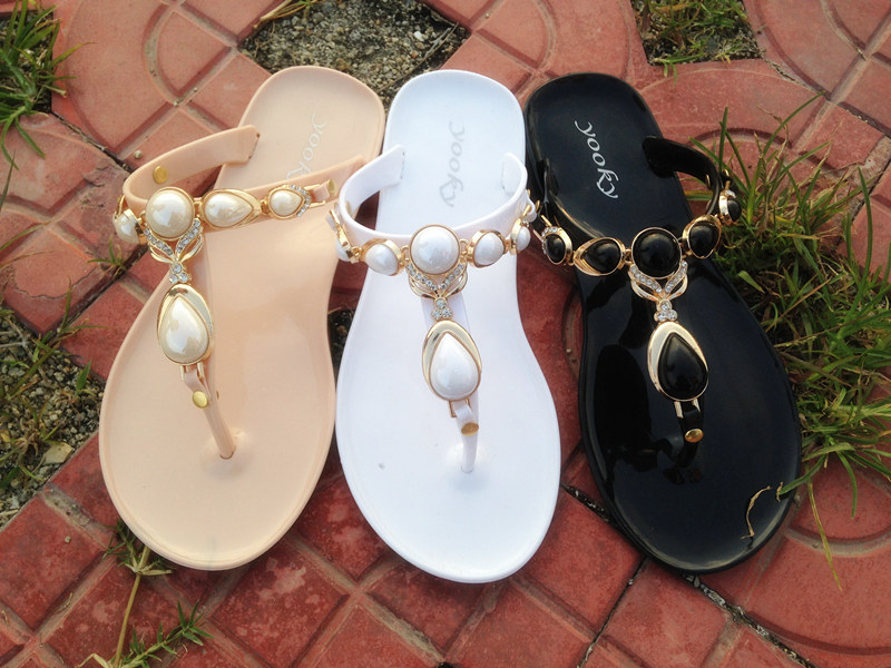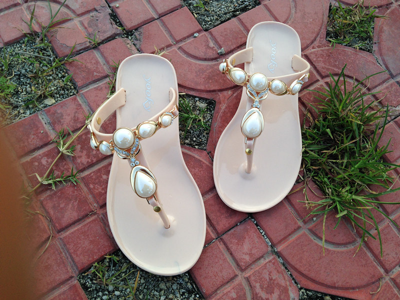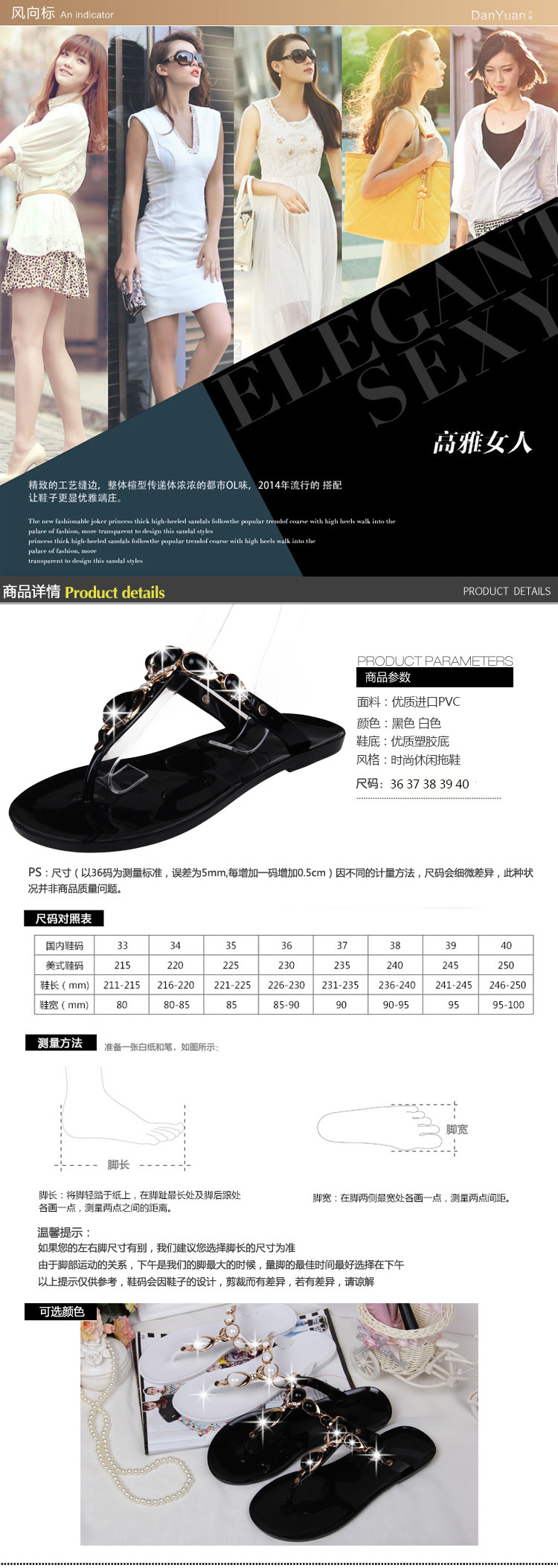 【尺码】:36-40码【跟高】:0.1cm【鞋面材质】:进口优质PVC【鞋底材质】:塑胶底【风格】:甜美休闲沙滩鞋 气质时尚【流行元素】:高仿宝石+捷克钻石 气质串珠 果冻色【闭合方式】:夹脚