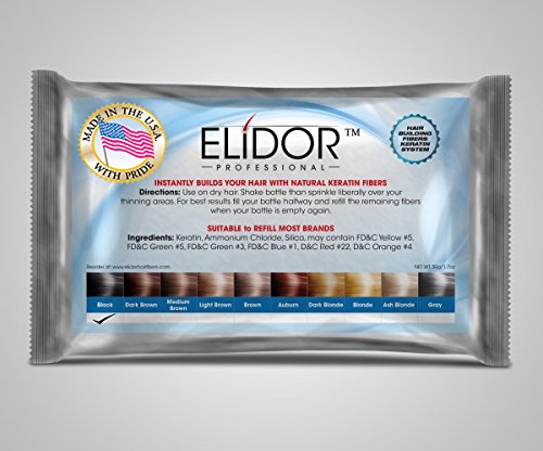 -. Feature : ELIDOR 25 Grams Refill Bag. Refills any Brands Bottles in Minutes for the Fraction of the COST! / ELIDOR Hair Building Fibers will conceal hair loss and Thinning Hair in 30 Seconds! / ELIDOR was designed to camouflage thinning hair and bald spots by filling them in with microscopic hair fibers. / Shaking the ELIDOR fibers over your head permits them to get electrically charged so they can stick to your hair. / Bald spots get covered and thinning hair gets thicker thanks to the new hair created by the fibers.