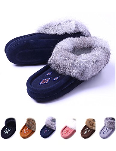 -. Title : Genuine Suede Leather Women Moccasin House Slippers, Comfort Warm fleece lining, Slip-on Soft Leather Sole, Rabbit Fur Collar,Winter Warm Indoor Slippers Fashion