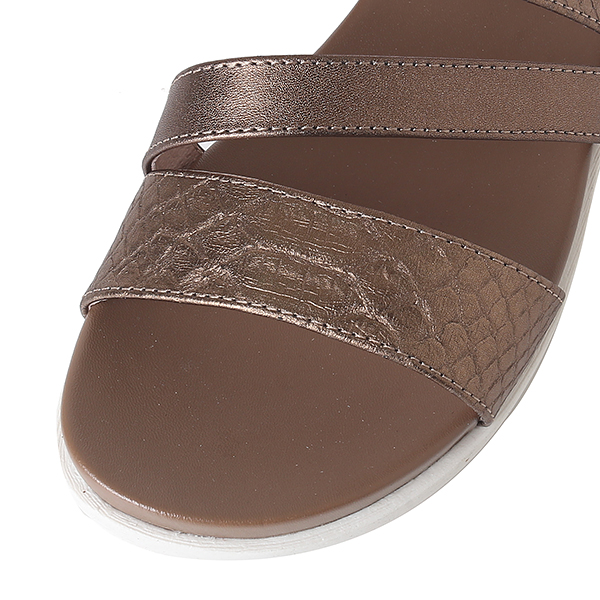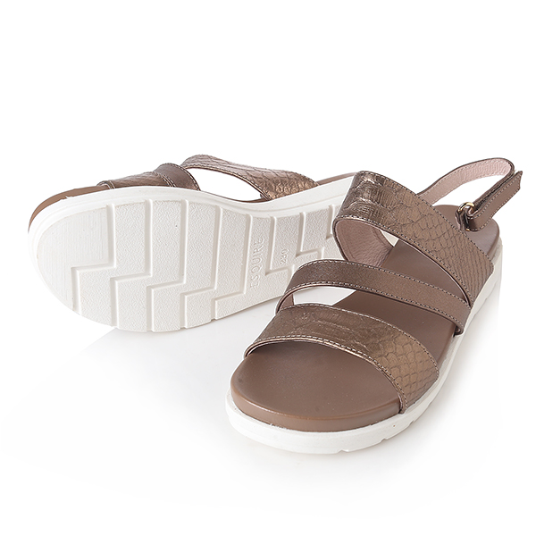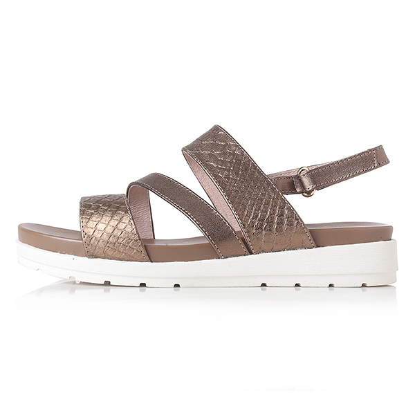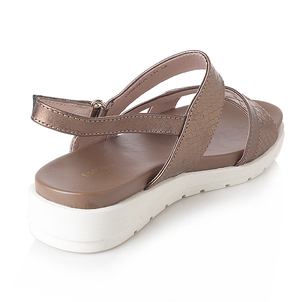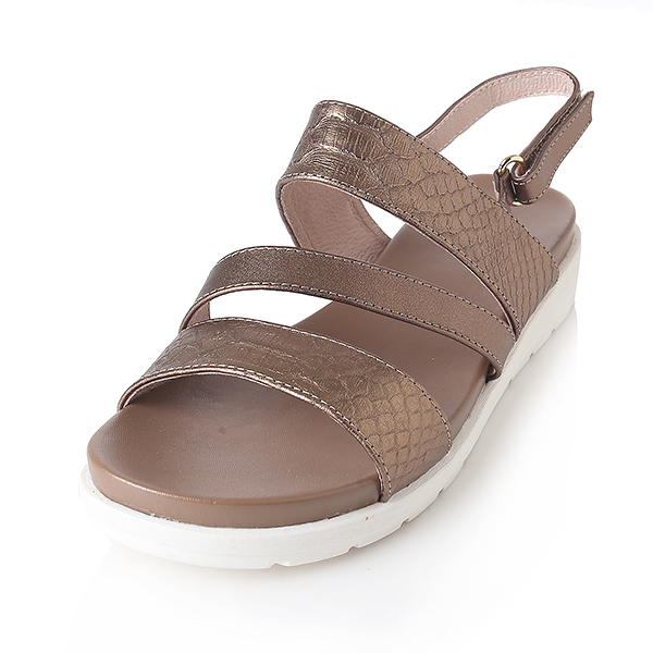 케주얼한 스타일의 메탈릭 샌들로 편안한 몰드창과 뱀무늬의 스트랩이 발을 편안하게 감싸줌. 뒤쪽의 벨크로 밴드는 조절이 가능함