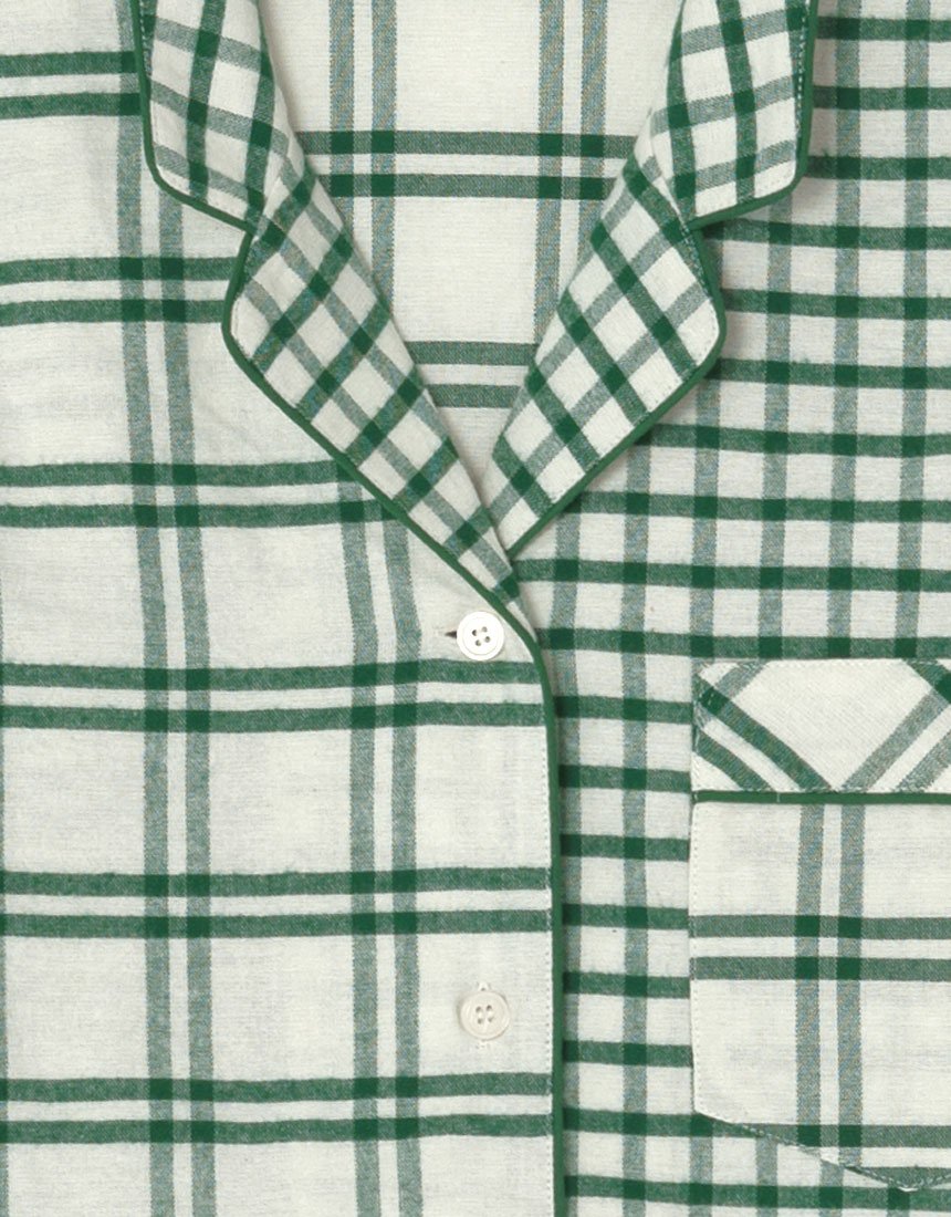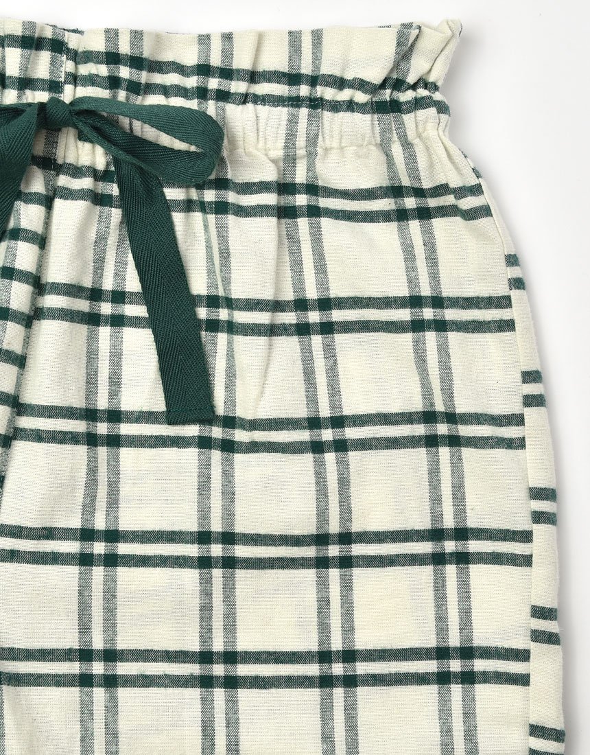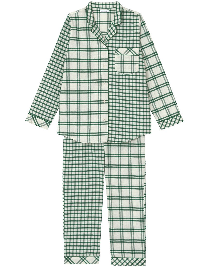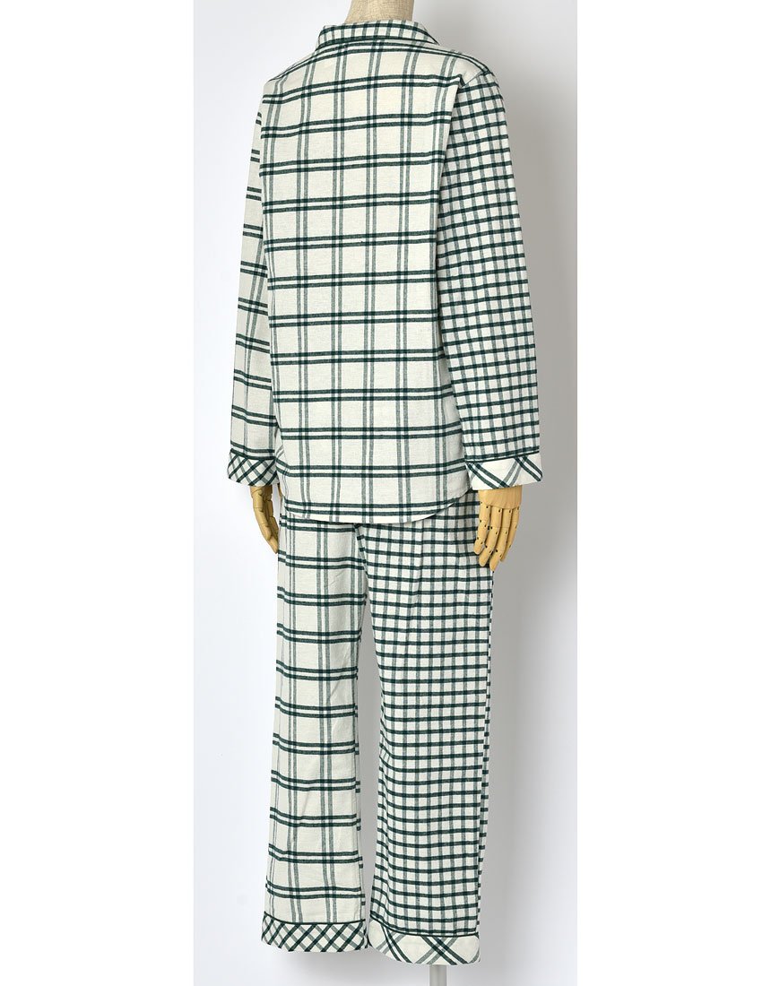 The upper and lower set of pajamas of design combining two types of check fabrics like patchwork.