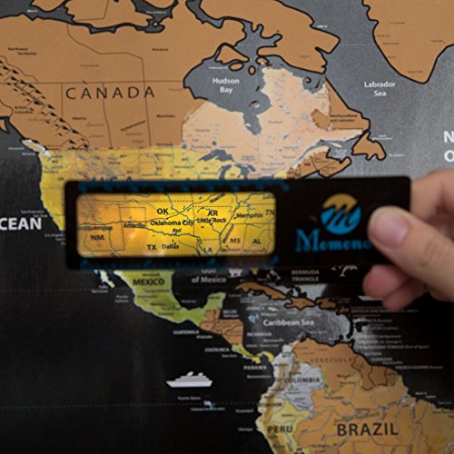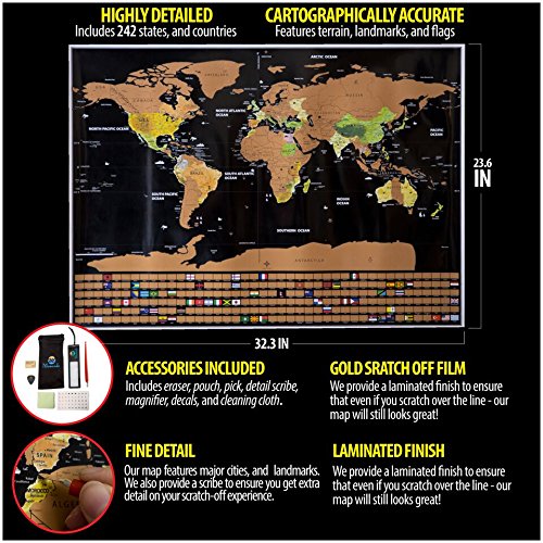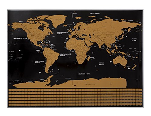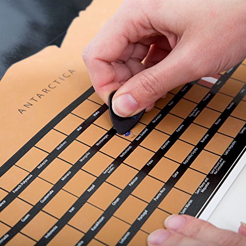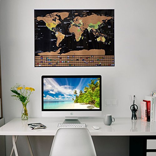 Keep your travel dreams alive- Whether you are an occasional traveler or someone who yearns to visit the 4 corners of the globe, the Momondo World Scratch Off Map lets you instantly see where you've been and what locales are still on your bucket list. The sophisticated look of the gold scratch coating against a matte black background makes this a functional home decor accessory in any room. It is also a great way for growing businesses to track their expansion into new territories. Richly detailed by an expert cartographer- We've created the most true-to-scale flat earth map available, paying particular attention to accuracy of borders and island placement. No matter where your adventures take you, you'll be able to scratch it off of the Momondo World Map Poster when you return home. Have fun "collecting" corresponding national flags at the bottom of the map, too, with this deluxe scratch off world map. If you're in a band, scratch off tour stops with your favorite guitar pick. Bring back currency from each country and ceremoniously use it to add another nation to your "been there, done that" collection. For home, office or wherever you go- Our resilient matte poster with laminate finish is easily mounted in an open-face poster frame, or can be suspended by binder clips or glue dots to walls or whiteboards. Why wait to return home? Our map also stores in its own 24.8" x 2.04" poster tube, traveling with you so you can scratch off countries as you visit them in real time. Grab a coin and reveal your travel history. Add the Momondo Scratch Off Travel Map Poster to your cart today.Feature