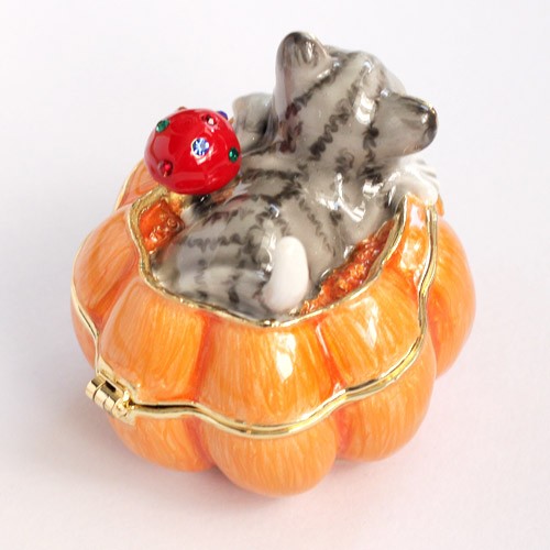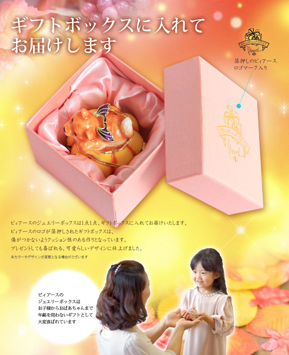| ジュエリーボックスと言えば、指輪やピアス、ネックレスなどのアクセサリーを入れる引き出し型のケースを思い浮かべる方が多いかもしれません。 ピィアースのジュエリーボックスは、動物や花などをモチーフに作られ、合金製でずっしりとした重さがあります。また高品質のクリスタルガラスを贅沢に使用。まるでジュエリーボックスそのものが宝石のような、高級感溢れる仕上がりです。 小物入れとしても使えるように開閉口には磁石が取り付けてあり、アクセサリーなどなくしやすいアイテムの収納ができます。キラキラと美しく輝く宝石箱は、そのまま飾って楽しめるインテリア雑貨として多くの方に愛されています。 国内トップクラスのジュエリーボックスメーカーであるピィアースは、2004年ごろから本格的に宝石箱の製造を始め、現在のジュエリーボックスはなんと300種類以上。大規模展示会でもご好評いただいており、全国有名百貨店でも販売されています。 自社工場でひとつひとつ丁寧に手作りし、原型作成、研磨、加工、着色、小さなクリスタルガラスの取り付けなども全て手作業で行われるこだわりのハンドメイド品。完成後は厳しい検品の後、丁寧に梱包作業をしお客様にお届けしております。 ピィアース商品は、全国有名百貨店および全国有名宝石店チェーンにてお取り扱いいただいている高品質商品です。 ★自分へのご褒美に…コレクションして並べて飾ると、さらにかわいらしさUP! ★恋人へのプレゼント…中にアクセサリーを入れて、サプライズな贈り物として ★家族への感謝ギフト…お母さんや姉妹へ、日頃のありがとうの気持ちを込めて ★誕生日プレゼント…お友達の喜ぶ顔が見たいから、いつもと違うキラキラギフトを ★小さな女の子へ…まるでお姫様が使っているようなキラキラ宝石箱は女の子の憧れ! |