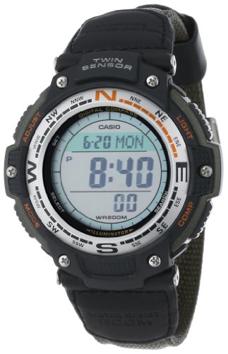 Amazon.com Product Description Complete with a digital compass, Casio's Twin Sensor Watch #SGW100B-3V boasts innovative technology and sporty digital design. Temperature and direction readings make this rugged timepiece ideal for workouts, outdoor adventures, and water sports. There's also world time (29 time zones/48 cities), magnetic declination correction, a 1/100-second stopwatch, four daily alarms and one snooze alarm, auto calendar pre-programmed until the year 2099, and a mineral glass for extra protection against scratching. Direction readings and time are indicated on a large LCD that is divided into three segments for a clear, easy-to-understand display. Water resistance to 660 feet and a rugged resin band ensure durability, while digital quartz movement provides reliable precision. This watch is protected by a one-year manufacturer's warranty.