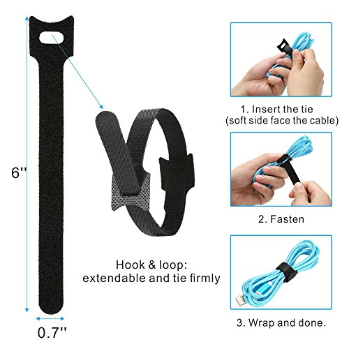 Cable Clips and Ties 100 Count - Adhesive Wire Clamps Fasten Cable Ties Organizer 6 inch Straps with Hook and Loop Wrap Cord Management Drop for Car, Office, Home