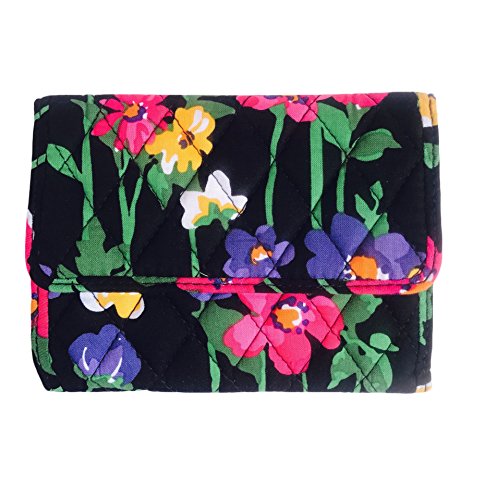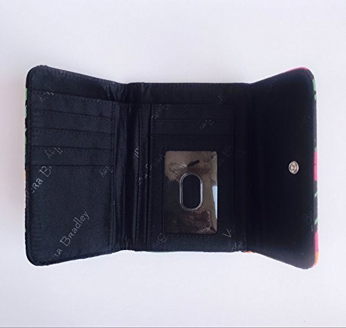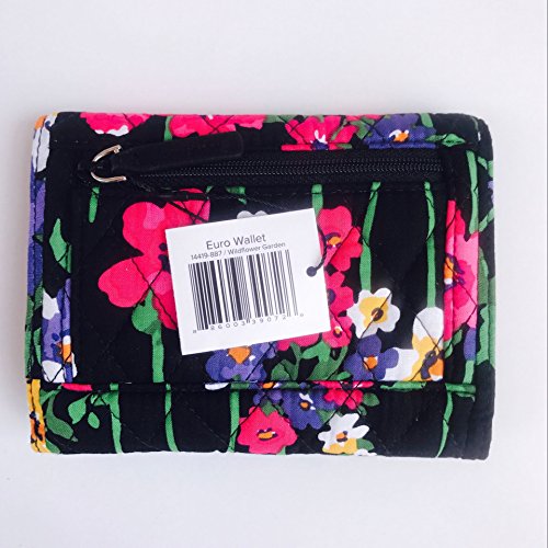 Vera Bradley's Euro Wallet is made of soft quilted fabric on the outside with a coordinating solid custom print logo fabric on the interiors. The interior features 5 card slots, a full length bill compartment on the upper edge and a clear ID window. It also offers 3 interior slip compartments. The trifold style secures with a snap closure and the back offers an gusset zippered compartment. It measures approximately 5.5 inches (L) x 4.25 inches (H) x 1 inch (W). The location of pattern varies with each wallet. Spot clean with a damp cloth and mild soap.Feature