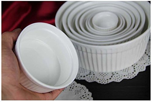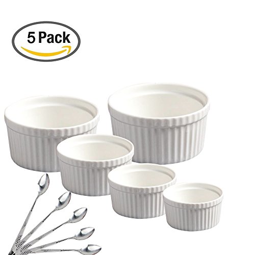 Leoyoubei White Ceramic Ramekin Bowl Set of 5 - Cake Baking Mold 5 Size Bowl Dishes Pudding Cup for Baking or Making Desserts And Stainless Steel Spoon 5 Pcs