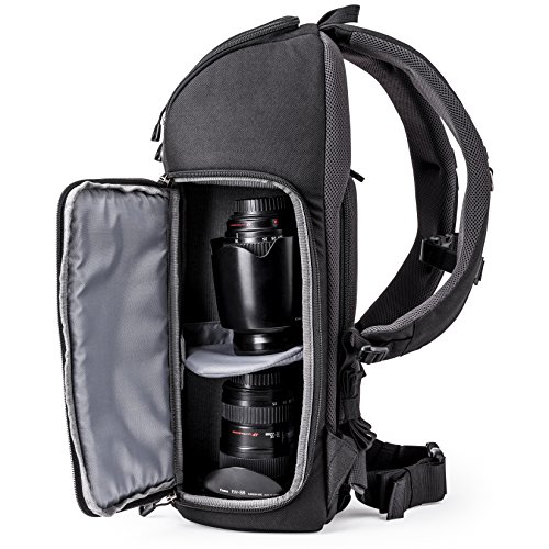 The Trifecta 10 DSLR Backpack is specifically designed for your three workhorse lenses. Access your ultrawide, midrange, and/or telephoto zoom lenses quickly and easily. This versatile backpack gives you access to your DSLR system without having to take off your bag. Perfect for any shooter on the move, the rear panel opening offers complete access to your gear when you need to work directly out of your bag. You can also configure it for photo and/or personal items. The slim silhouette is comfortable and appealing, and helps you easily navigate through crowds. With the Trifecta 10, enjoy quick access and be ready "before the moment."Feature