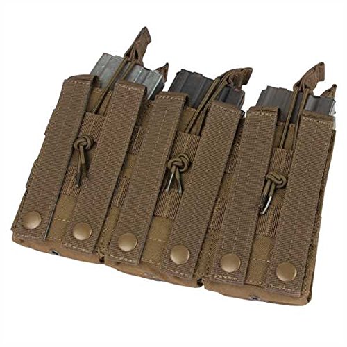 -. Binding : Misc. -. Brand : Condor -. Feature : Designed to to provide secure storage of and quick access to much needed, additional ammunition / Holds a total of six M4/M16 magazines / Six molle straps on the rear to keep the mag pouch tight to your vest / Front pocket dimensions: 3"x4.5" (8x11cm). Back pocket dimensions: 3"x5.75" (8x14cm) / Weight: 255g -. Label : Condor -. Manufacturer : Condor -. ProductGroup : Sports -. ProductTypeName : SPORTING_GOODS -. Publisher : Condor -. Studio : Condor -. Title : Condor Tactical Triple Stacker Open-Top M4 Mag Pouch