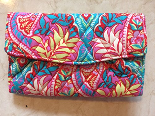 Wrapped in Vera Bradley's iconic print this strap wallet is a wallet and cross-body all in one! The magnetic snap closure secures an interior offering 12 card slots, a clear ID window and 3 full length bill compartments. The back offers a zippered pocket and a semi accordion zippered coin compartment. The removable strap offers a drop of about 23 inches. It measures approximately 7.5 inches (L) x 4.25 inches (H) x 1 inch (W).Feature