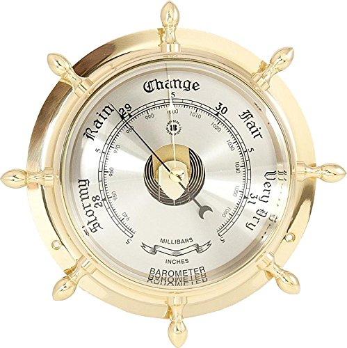 -. Feature : German precision barometer with unique ship wheel design / Encased in solid tarnish-proof brass / Beveled glass guards goldtone face / Weather conditions detailed in black, ornate script / Dimensions: 9.5D inches