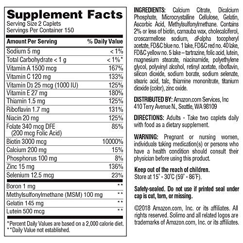 Solimo Hair, Skin & Nails Multivitamin caplets contain no artificial flavors, gluten, or lactose. Take two daily with food as a dietary supplement.