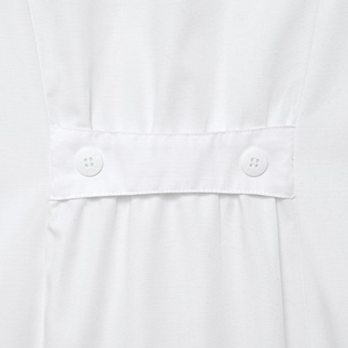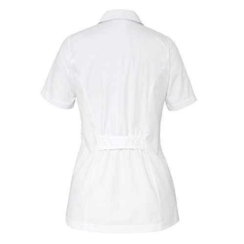 Crisply elegant traditional nurse wear is a classic staple. Princess cut fitted top features angled pockets, a lapel collar that lies flat in the neatest way and buttoned back belt detailing that creates soft shirring. Five button front closure and stitched seams throughout. Center back lenght 27" in size M.Feature