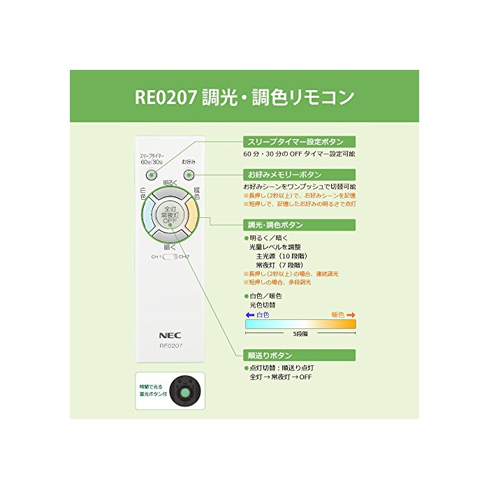리모콘:【전등상야등OFF】조빛: 연속조광(100%~약10%)고, 다단조빛(100%~약10%(10단계))고, LED상야등(7단계조광)고, 멸,조색단계5단계