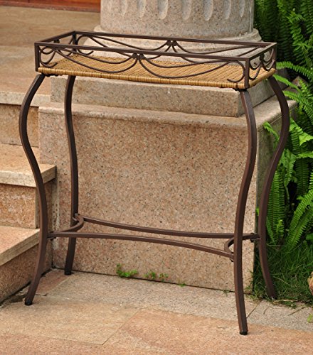 Studio : International Caravan Inc Publisher : International Caravan Inc Product Description The Valencia Resin Wicker / Steel Rectangular Plant Table has an attractive style and adds the beauty of nature to your outdoor area. This planter stand is made with a sturdy metal frame and weather resistant resin wicker. Accent your patio with the beautiful Valencia Resin Wicker / Steel Rectangular Plant Table. This wicker plant stand has an elegant look that will enhance the beauty of any sun room or patio. This outdoor plant stand has light pecan resin wicker which strikes a pleasant contrast to the matte brown frame UV and weather resistant Features rails that will keep your plants on the stand and not on the ground 0