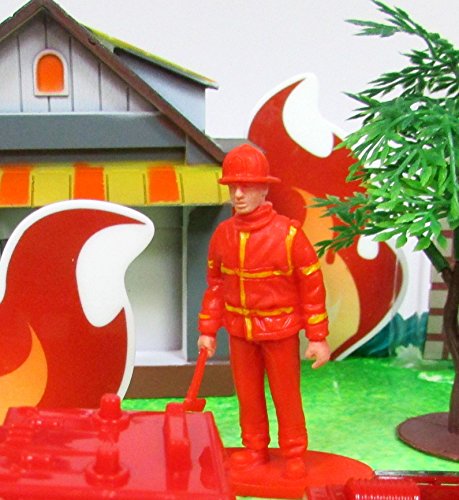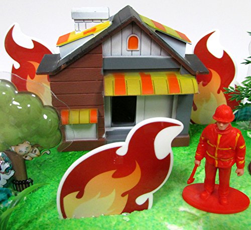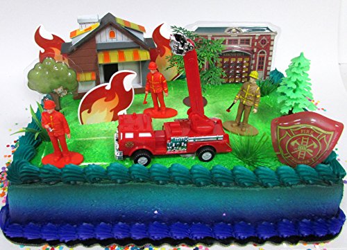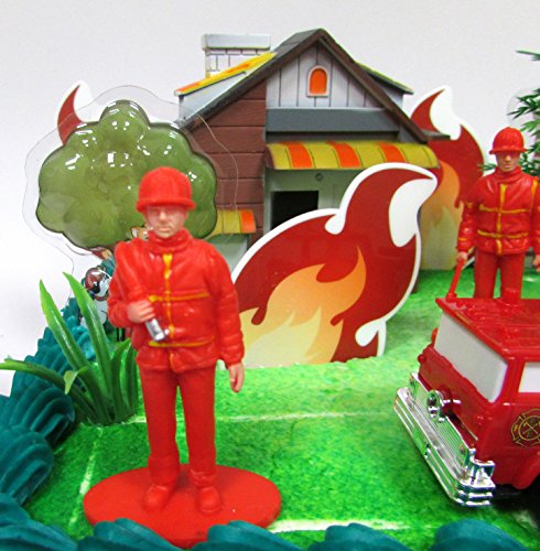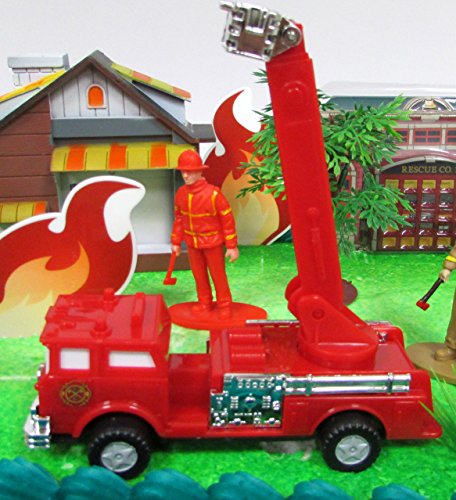 Fireman Themed Birthday Party Cake Topper with Fireman Figures and Decorative Themed Accessories