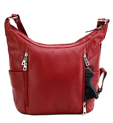 -. Feature : SAFETY - Zipper pulls on the concealment gun compartment feature decorative cut outs large enough to fit a lock through, allowing you to secure your weapon to prevent accidents. / EASY DRAW - The discreet gun compartment zips open from both sides, allowing your weapon to be accessible from the left or the right hand. This ensures that you can easily draw your weapon if needed, without wasting precious seconds looking for it in your purse. / STYLE - Carrying safely doesn't have to mean missing out on style. The sleek, classic silhouette of this bag is perfect for dressing up or down, so you can take it to work or a night out on the town. / QUALITY - The Silver Lilly Concealed Carry Handbag is crafted from quality genuine leather, making it durable enough for every day use. Carry as a standard shoulder bag or use the adjustable strap to convert to a crossbody. / PRODUCT SPECIFICATIONS - Bag measures 9" x 11"x 6" with 21.5" strap drop; gun pocket measures 8.15" x 8"
