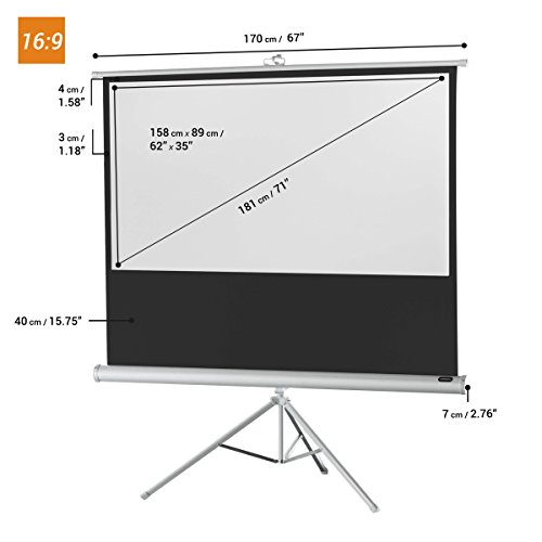 celexon portable projector screen Tripod Economy 71" - White Edition The celexon 71“ tripod projector screen is part of the celexon Tripod Economy Series, wich provides products of high quality for a good price-performance ratio. This tripod screen is adjustable in its height and available for different aspect ratios (1:1, 4:3, 16:9 formats). The screen has a gain factor of 1.0 and can be used for LCD and DLP projectors. The black back is impervious to light and ensures a perfectly clear projection. Due to the black border the screen has an increased contrast and the fabric is perfectly flat. The integrated keystone bracket enables a high quality projection without keystone distortion. Celexon tripod projector screen Tripod Economy ? Key features: - 62 x 35 inches viewing area