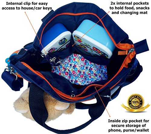 [Description] STYLISH & FUNCTIONAL ★ The Refined and Sophisticated bag ★ Elegant_ stylish and super functional diaper bags for mom and dad ★ 11 diaper bag organizer pockets and compartments for you and your baby / toddler essentials ★ Also available in bold Navy & Orange MULTI-PURPOSE & VERSATILE ★ Transforms into a stroller organizer using built-in universal stroller bag clips ★ Open access pockets on the outside ideal for holding drinks_ snacks and wipes ★ Tote handles AND shoulder / cross body strap for versatility SAFE & SECURE ★ Holds tablet or laptop in secure outside zip pocket ★ Internal zip pocket for storing cell phone and purse / wallet ★ Internal key clip for quick and easy access to your house or car keys QUALITY BY DESIGN ★ Diaper Bag is Navy Blue with Dark Orange trim ★ Made of super high quality_ durable 420D + 210 polyester ★ Lightweight. Hardwearing. Easy to clean ★ Comes with chunky metal clips_ rings and adjusters ★ Made for Life 100% NO RISK GUARANTEE ★ Makes the perfect Baby Shower gift! ★ Includes BONUS Padded Changing Mat & Insulated Bottle Bag ★ All diaper bags backed by a 100% Risk Free Money Back Guarantee