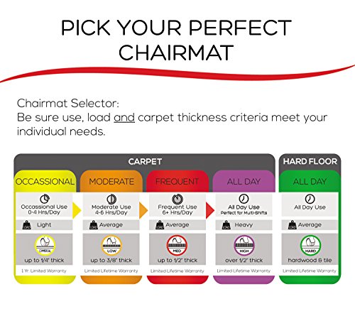 -. Binding : Kitchen -. Brand : Deflect-O -. Color : Clear -. EAN : 0079916060460 -. Feature : Protective vinyl chairmat safeguards and protects carpets from wear and tear. / Medium weight chairmat for frequent use on carpets up to 1/2" thick, Medium Pile; choose a higher pile chairmat if usage is over 6 hours. / Easy-glide rolling surface provides effortless chair movement. / Studded, vinyl and beveled chair mat for medium weight carpeting / Maximum clarity and transparency, allowing the beauty of carpeting to show through / Smooth beveled edges for easy roll on and roll off / Textured top surface is slip and scuff-resistant / Unique notched stud design grips carpet without piercing or harming carpet backing -. Label : United Stationers -. Manufacturer : United Stationers -. Model : CM14243 -. MPN : DEFCM14243 CM14243 -. NumberOfItems : 1 -. PackageQuantity : 1 -. PartNumber : DEFCM14243 CM14243 -. ProductGroup : Furniture -. ProductTypeName : HOME_FURNITURE_AND_DECOR -. Publisher : United Stationers -. Size : 45 by 53-Inch -. Studio : United Stationers -. Title : deflecto CM14243 Beveled 45 x 53 Clear SuperMat Frequent Use Chair Mat Medium Pile Carpet -. UPC : 079916060460 -. Warranty : Manufacturer's limited lifetime guarantee against chipping, breaking and shattering