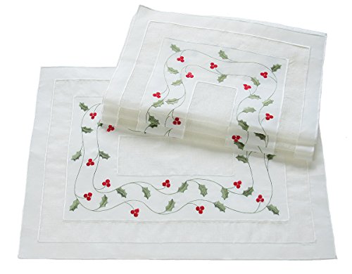 - Elegant holiday linens featuring embroidered holly leaves and berries!
