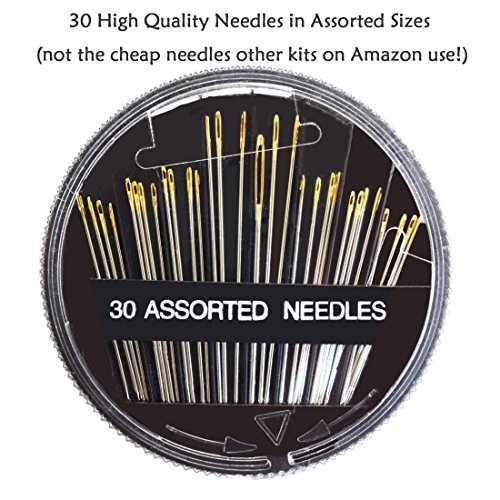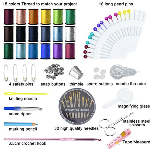 PROFESSIONAL SEWING KIT - This needle and thread sewing kit Includes Thread (Assorted Colors), Thimble, Measuring Tape, Safety Pins, Sewing Needle, Scissors, Buttons, Pearl Needle, Thread Cutter, and Threader