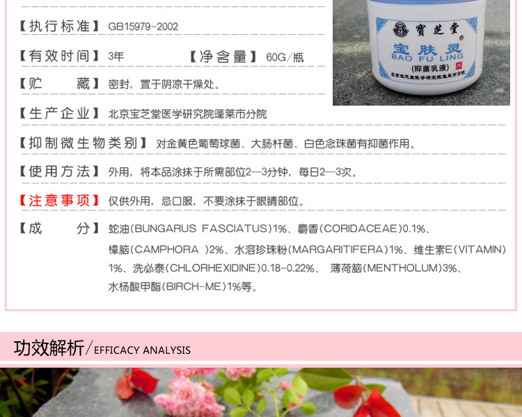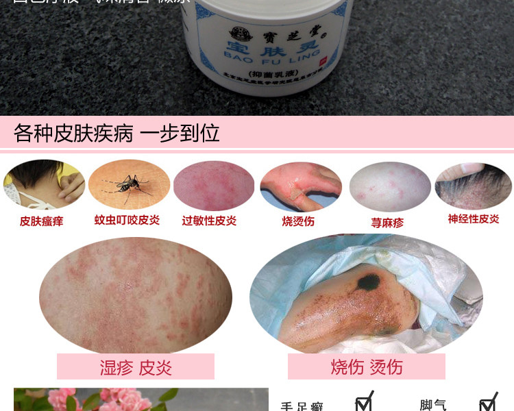【使用说明】烧伤烫伤患者要在第一时间涂抹宝肤灵,效果会非常明显的,如果是已经被烧烫一段时间了并且已经起?疱了,必须要先用消毒针把水疱挑破,然后在把药膏涂上去,效果也是非常好而且不会留下疤痕;蚊虫叮咬感染起疱了,马上涂上药膏1-3分钟可以立即见效;痔疮患者切忌不能饮酒、坚持使用,外痔2星期可以痊愈,内痔3个星期,具体使用方法请看视频。