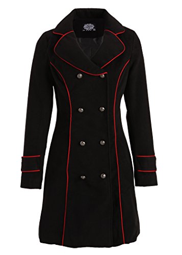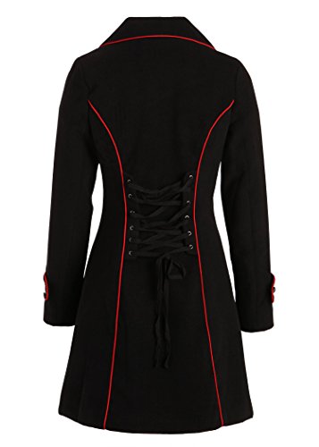 Product Description Stand and salute this modern, military-inspired black coat with red piping details. This fitted and flared coat is made out of soft wool-effect fabric and has beautiful cut. Not only the tailored fit but also the striking red piping details make this coat a fabulous addition to your winter wardrobe. The coat is cut fitted to the waist and flares at the bottom. Ornate military style buttons accessorize the front and a stunning corset lacing at the back of the coat makes for not only style but also an adjustable fit. Since the coat has a fitted cut, we recommend you may want to jump up a size (especially if you are in between sizes). Available in sizes S, M, L, XL, XXL, 3XL and 4XL. 0