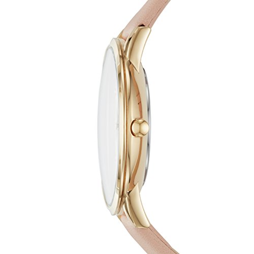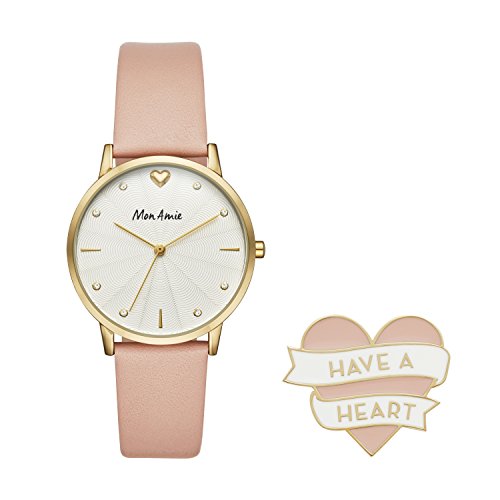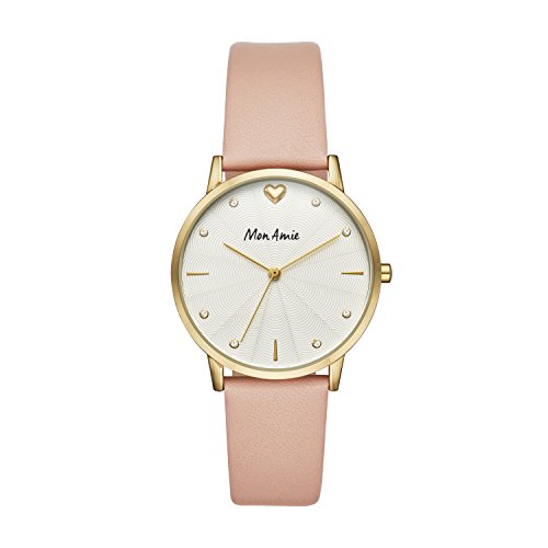 Round gold-tone plated stainless steel case; white textured dial with crystal hour markers and heart icon at 12 o'clock; genuine pink leather band with buckle closure